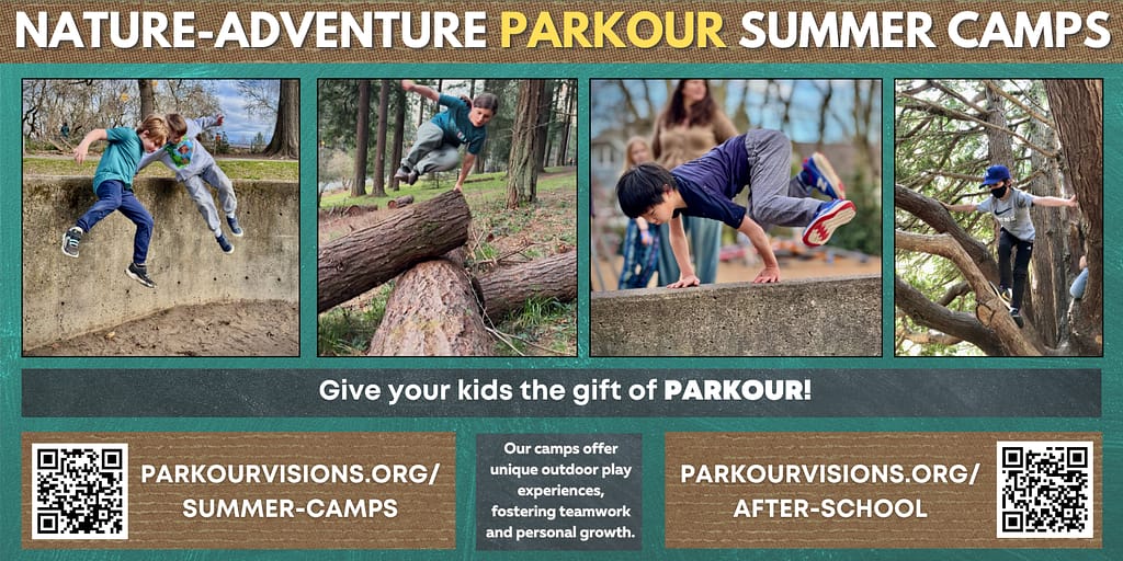 Parkour Visions offers weekly classes and summer camps with unique outdoor play experiences that foster teamwork and personal growth. Your kids will have a blast playing with other kids while developing their physical competency, building their confidence, and practicing skills for life!