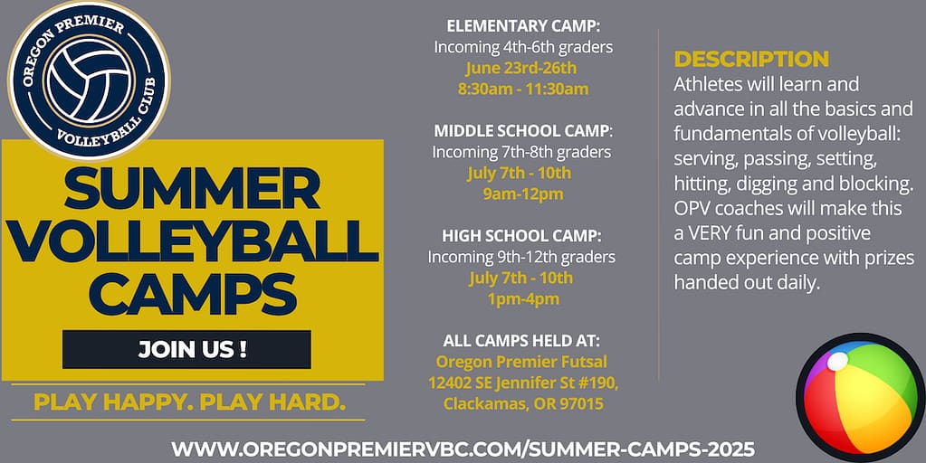 Oregon Premier Volleyball camps will help athletes learn and advance in all the basic fundamentals of volleyball: serving, passing, setting, hitting, digging and blocking. Details and registration at https://www.oregonpremiervbc.com/summer-camps-2025
