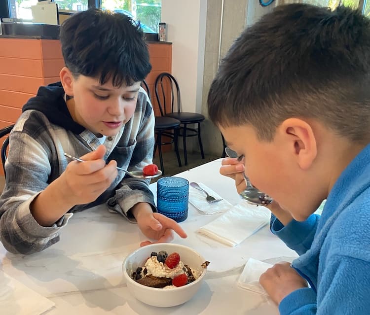 Since everything had been so good, we tried the tres leche cake topped with fresh berries ($6; pictured above). The server who brought it out joked that he could bring another one as my kids immediately attacked it with their spoons. I don’t usually like tres leche cake because it can be overly sweet and goopy. But the spongy cake and creamy topping were just right, especially with the fresh, tart berries. We decided we did need another dessert and ordered the Mexican chocolate brownie as well, which did actually taste like the Ibarra chocolate I’ve used to make hot chocolate with since I was a kid.