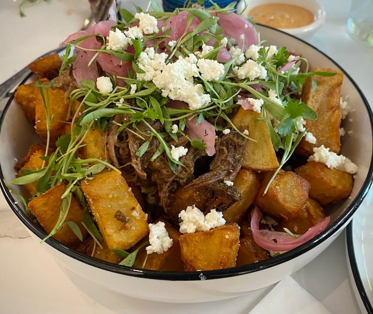 And we did wait a little bit, but we all decided it was worth it. The rib eye tacos (three for $21) topped with crispy onions, guacamole and cilantro might be the best tacos I’ve ever eaten (pictured left). The steak was plentiful and perfect. And the hefty housemade blue corn tortillas were superb. We also ordered the potato-filled taquitos topped with avocado sauce, shredded cabbage, queso fresco, pickled onions, cilantro, radish and chorizo ($15, pictured left). Everything was on point, the crunch, the toppings, and I liked that the chorizo was totally flavorful, but not greasy. Usually my potato-loving older child would be all over the potato taquitos, but they were busy with a massive bowl of fried potato cubes topped with tender, slow-cooked beef, queso fresco and pickled onion called papasotas ($15). Just when we thought beef couldn’t get any better than with the rib eye tacos, the braised beef bowled us over.