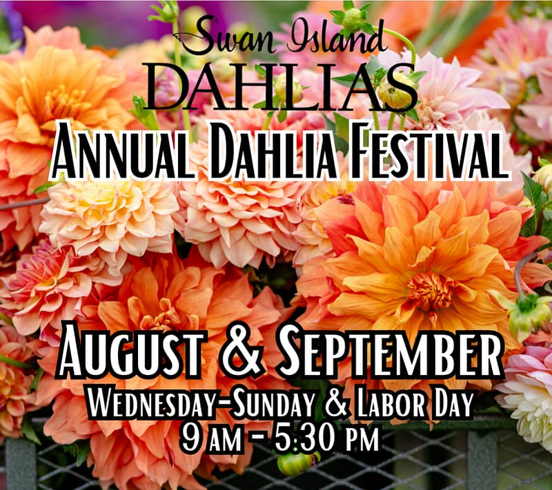 Celebrate the season of Dahlias! Stroll through almost 50 acres of breathtaking fields and a beautiful display garden of stunning dahlias featuring over 375 varieties. Treat yourself to a rainbow of colors by taking photos, shopping in our gift shop, and purchasing fresh-cut dahlias to take home. Select and order your favorite dahlias for spring delivery to enjoy the beauty in your garden the following year. Fill your belly with yummy treats from our Food Carts, relax and enjoy the Live Music on the weekend.